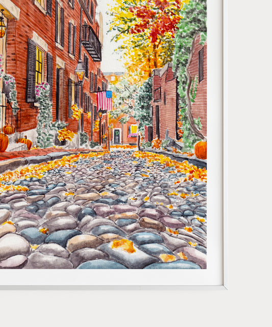 Arte mural otoñal de Acorn Street, Boston, pintura en acuarela, paisaje urbano de Boston, EE. UU., decoración otoñal, regalo de viaje