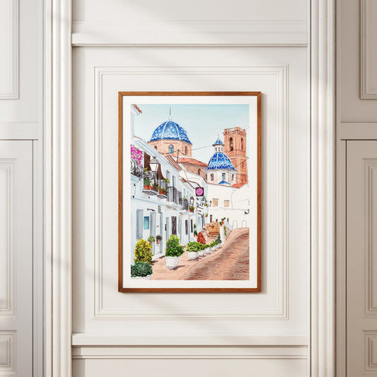Arte mural de Altea, Alicante, España, pintura de acuarela, paisaje urbano mediterráneo, regalo de viaje, decoración española