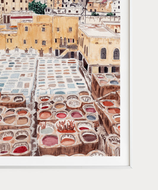 Arte mural en acuarela de Fez, Marruecos. Paisaje urbano de Fez. Decoración de curtiduría marroquí. Arte tradicional. Regalo de viaje.