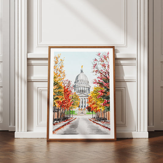 Madison Wisconsin Fall Wall Art, Watercolor Painting, Madison Cityscape, Housewarming Gift, United States Travel Art