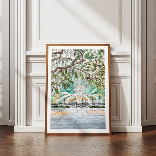 Forsyth Park Fountain Print, Savannah Wall Art, Watercolor Painting, Savannah Cityscape, Travel Gift