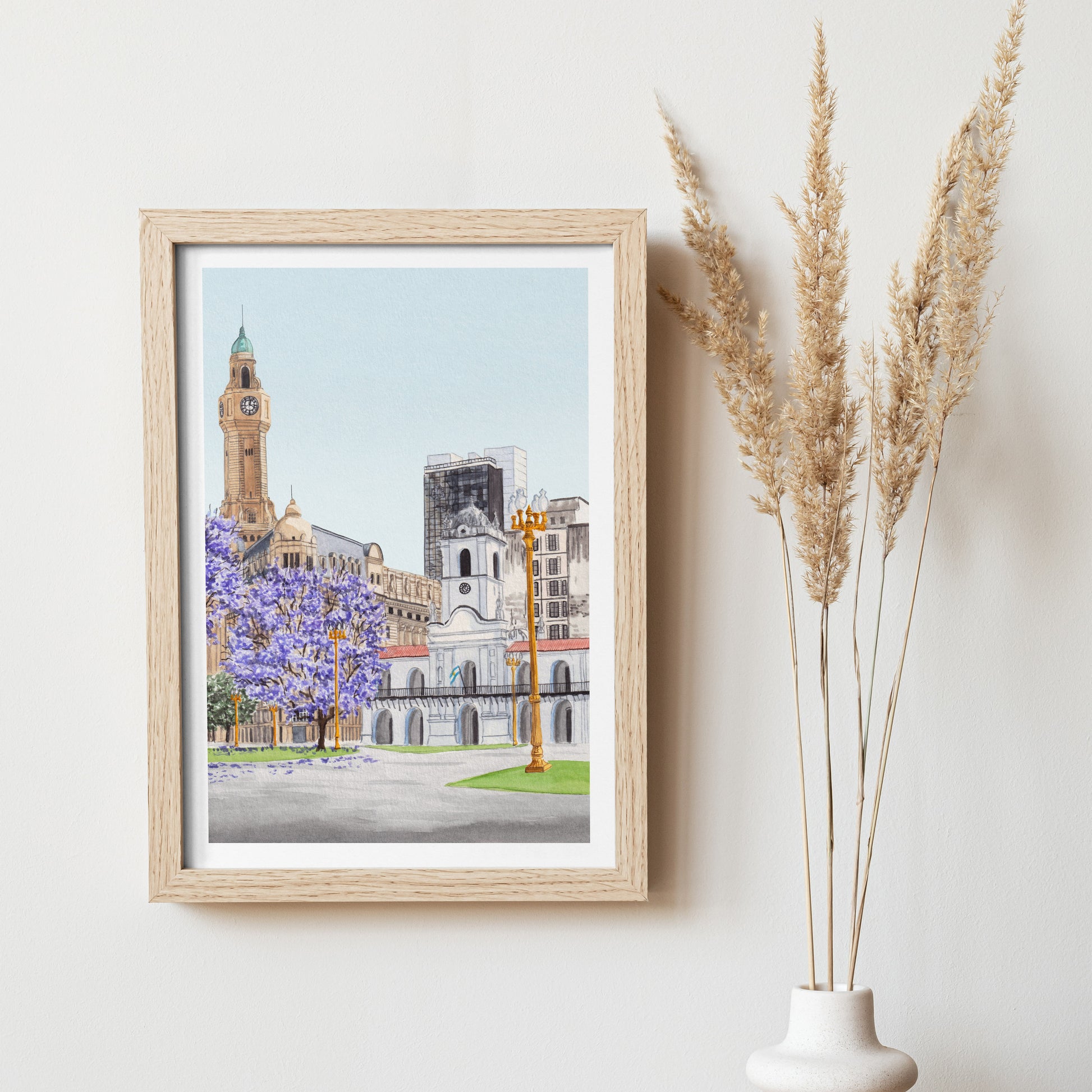 This hand-painted watercolor print captures the Cabildo of Buenos Aires in spring. Surrounded by blooming jacaranda trees, it highlights one of Argentina’s most historic landmarks.