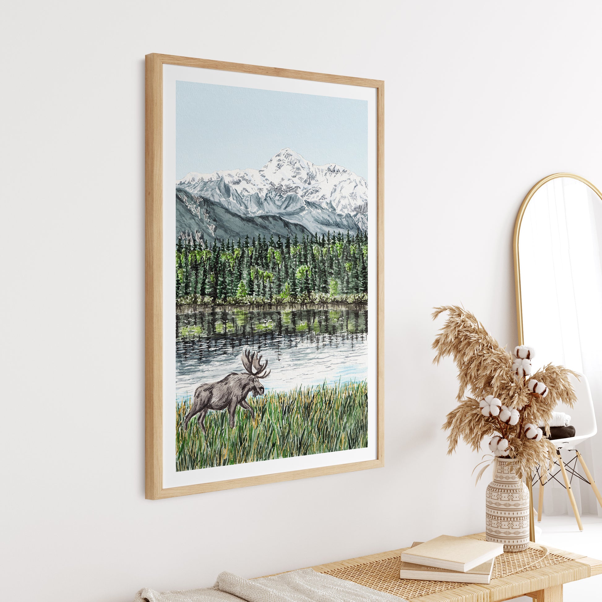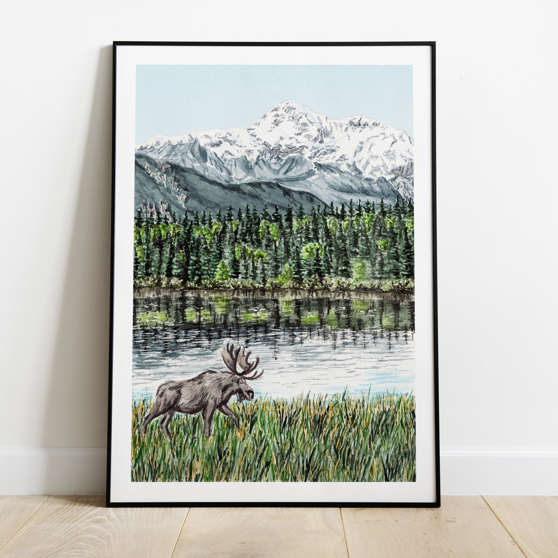 Hand-painted in watercolor, this high-resolution print captures the beauty of Alaska’s Mount Denali. A perfect piece to bring the majestic spirit of the Alaskan wilderness into your home or to gift to a nature and travel lover.