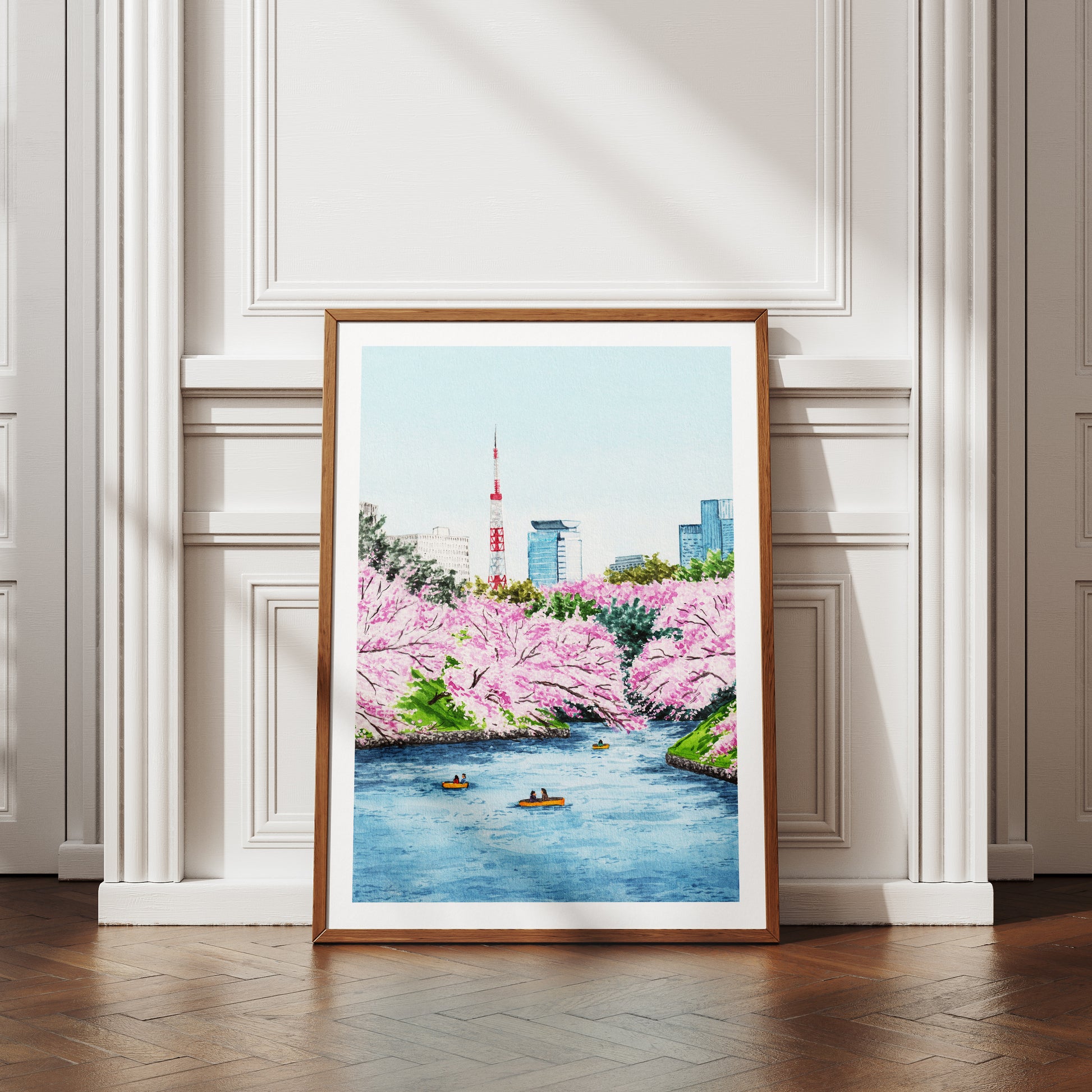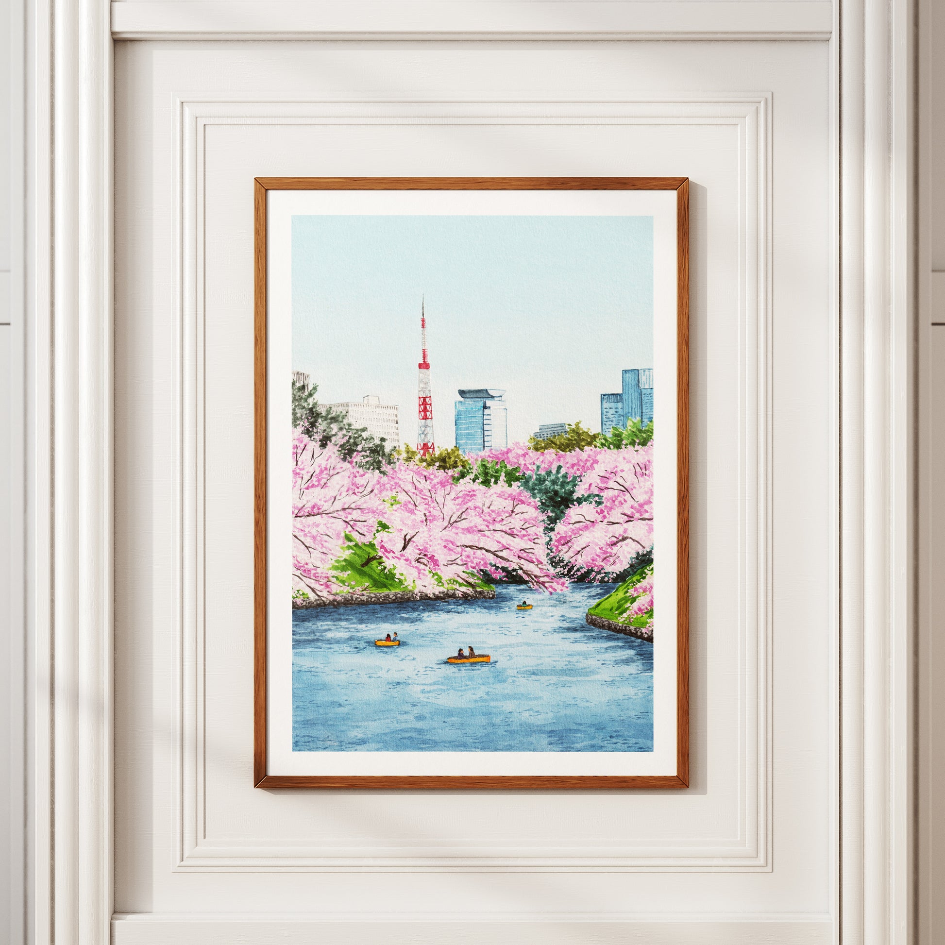Hand-painted in watercolor, this high-resolution art print captures the charm of Tokyo Tower in Japan during spring, surrounded by blooming cherry blossoms. It brings a serene touch of Japanese beauty to your space, perfect for wall decor or as a thoughtful gift for travel and art lovers.
