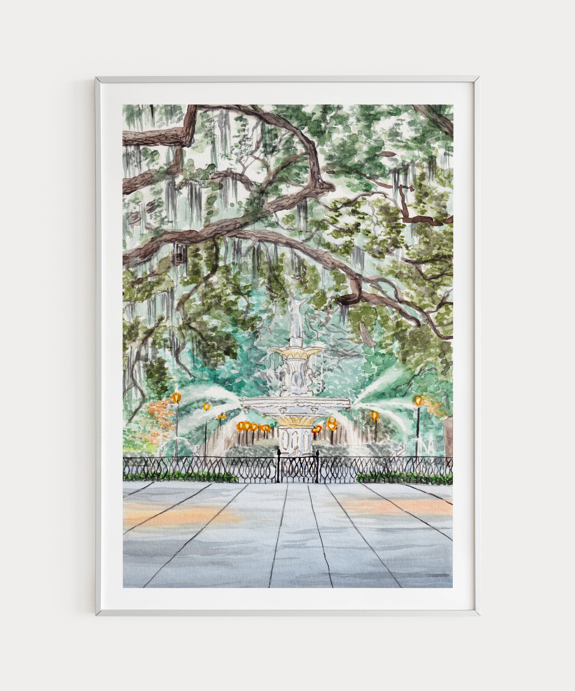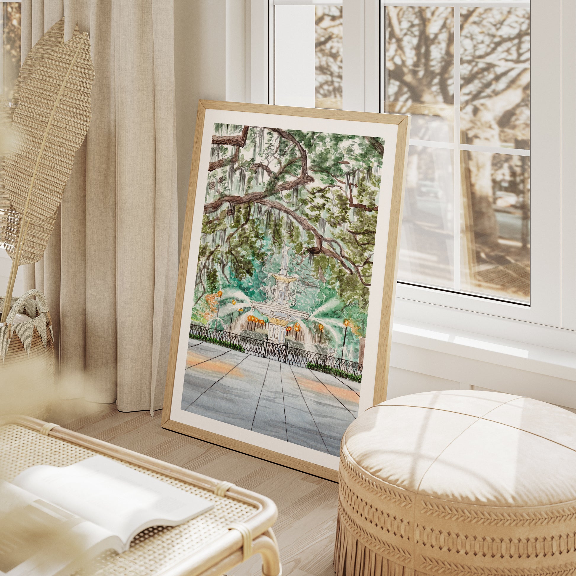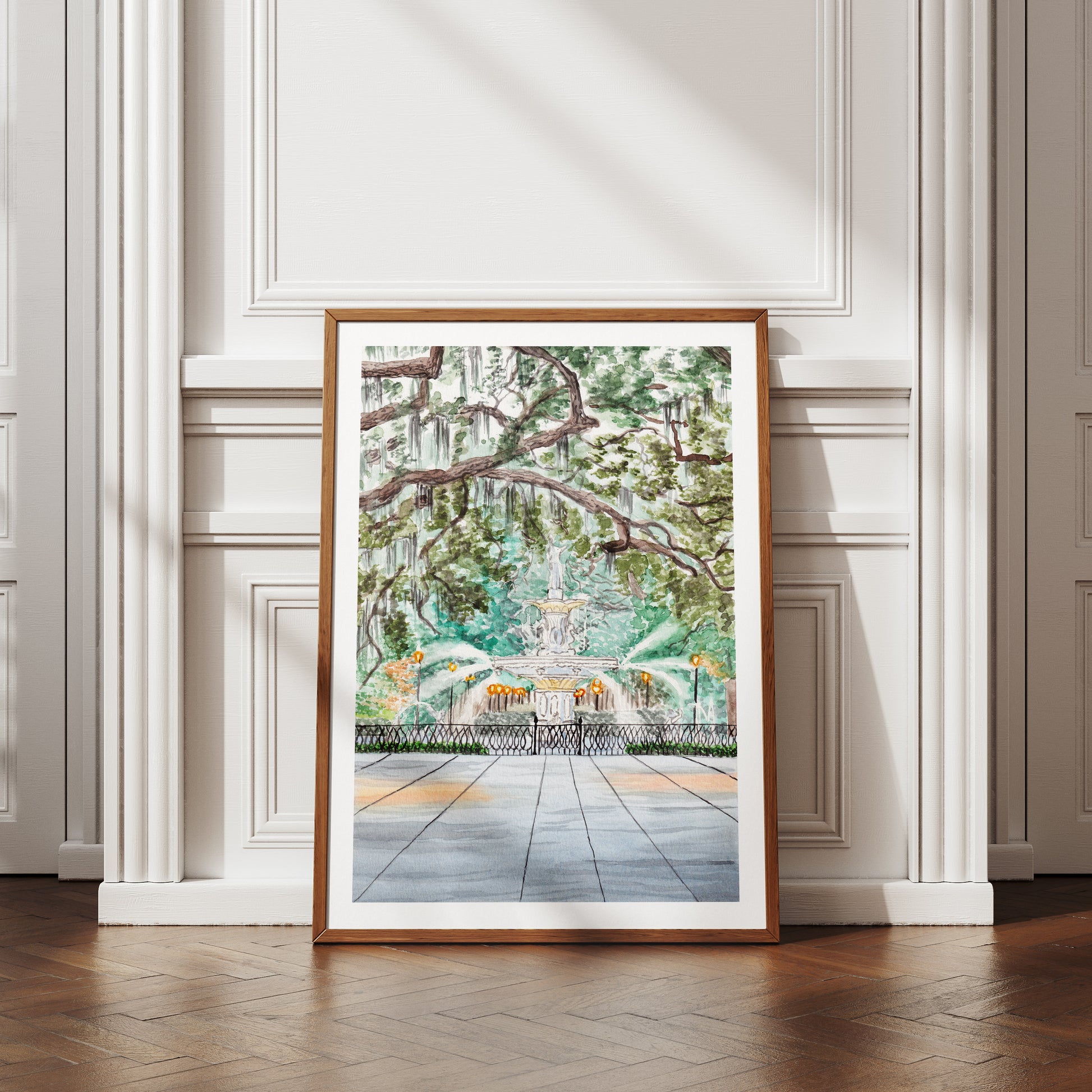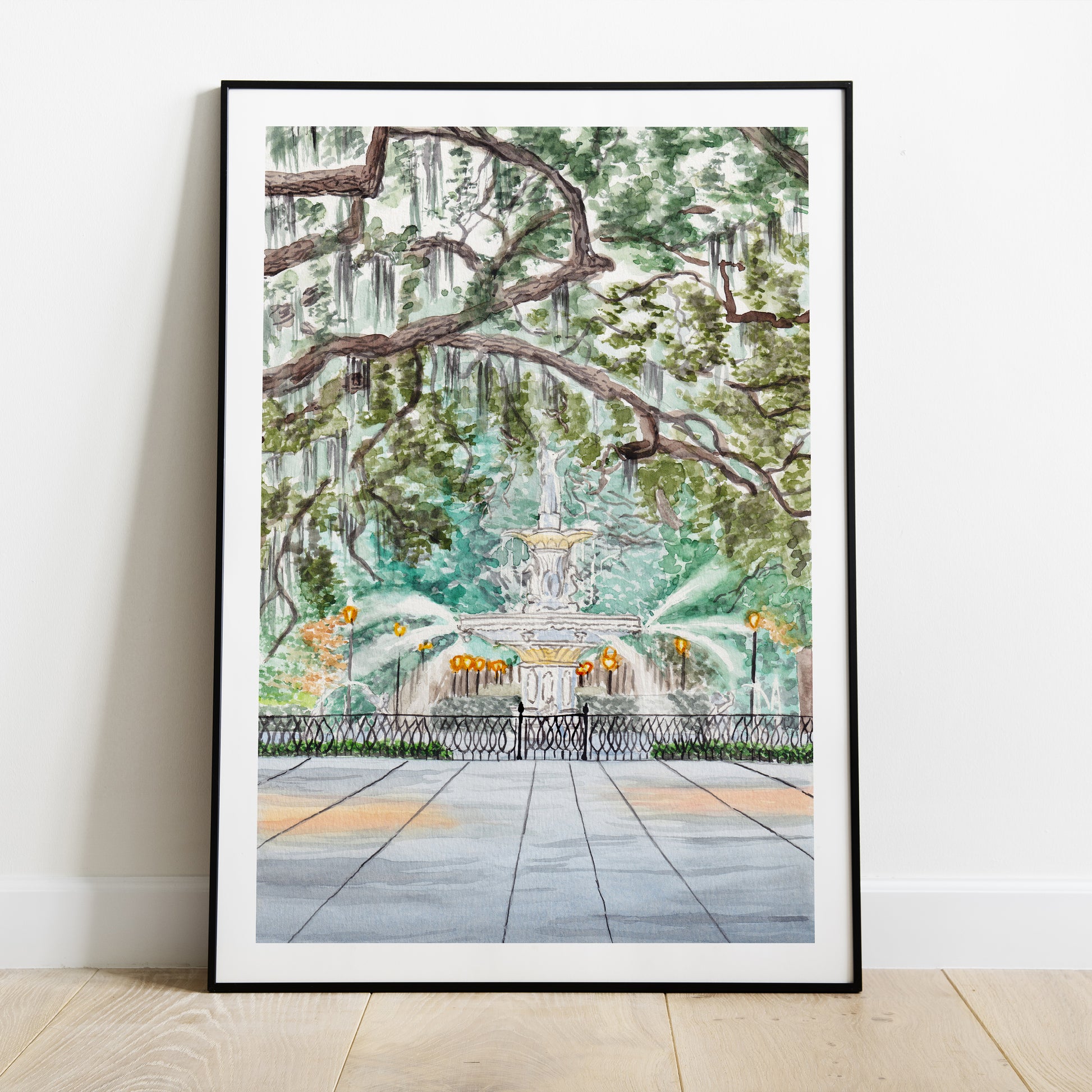 Hand-painted in watercolor, this high-resolution art print captures the beauty of Savannah, Georgia, featuring the iconic Forsyth Park Fountain. With rich Southern character and nostalgic detail, it brings a warm touch of American heritage to your space. Perfect for wall decor or as a meaningful gift.