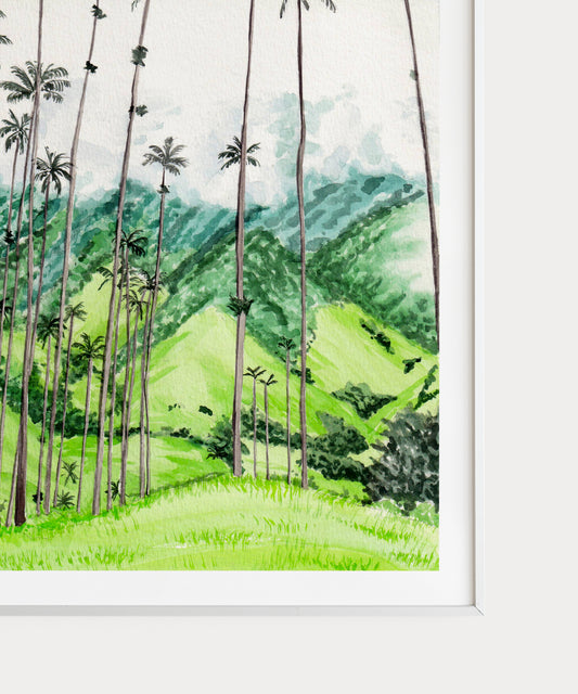 Impressão artística em aquarela do Vale do Cocora, Colômbia | Paisagem icônica de palmeiras | Presente de viagem