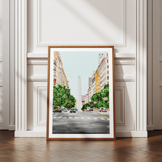Impressão artística em aquarela da paisagem urbana do Obelisco de Buenos Aires | Decoração de monumentos argentinos | Paisagem urbana de Buenos Aires | Presente de viagem