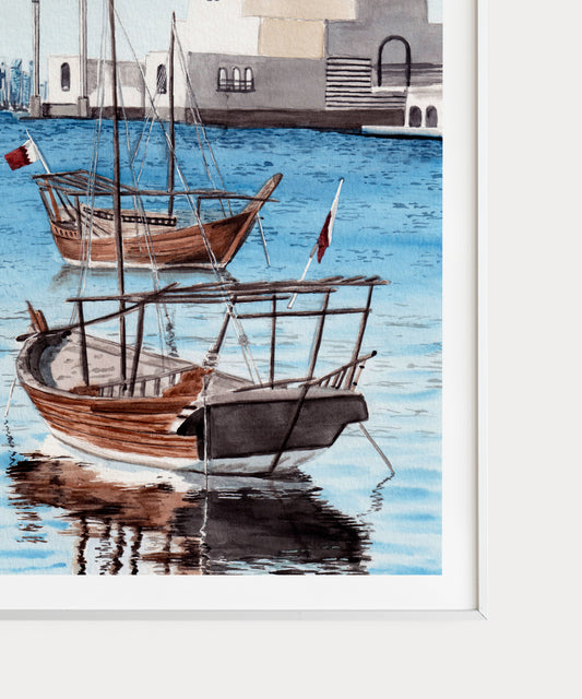 Impressão em aquarela de Doha, Catar, decoração do Oriente Médio, paisagem urbana de Doha, pintura do Catar, presente de viagem