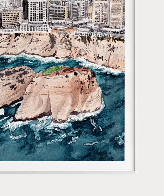 Arte de parede da Baía de Raouche em Beirute, pintura em aquarela, arte do Líbano, decoração do Oriente Médio, paisagem urbana de Beirute, presente de viagem