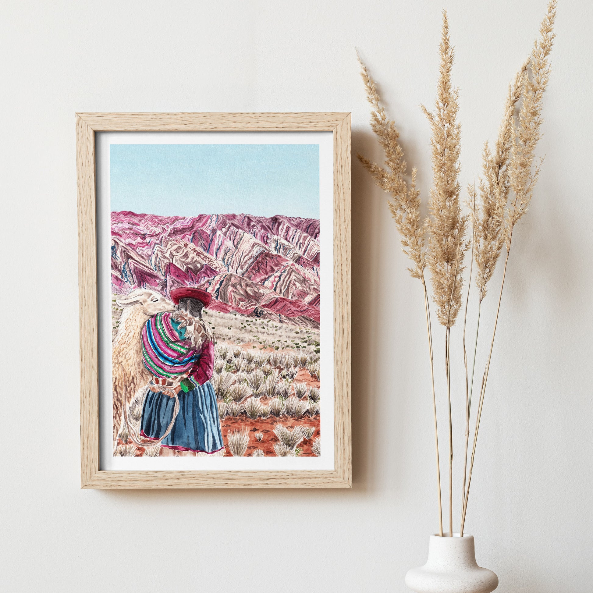 This hand-painted watercolor print captures the breathtaking landscapes of Jujuy, Argentina, featuring the colorful Andes mountains and the unique charm of northern Argentina’s highlands.
