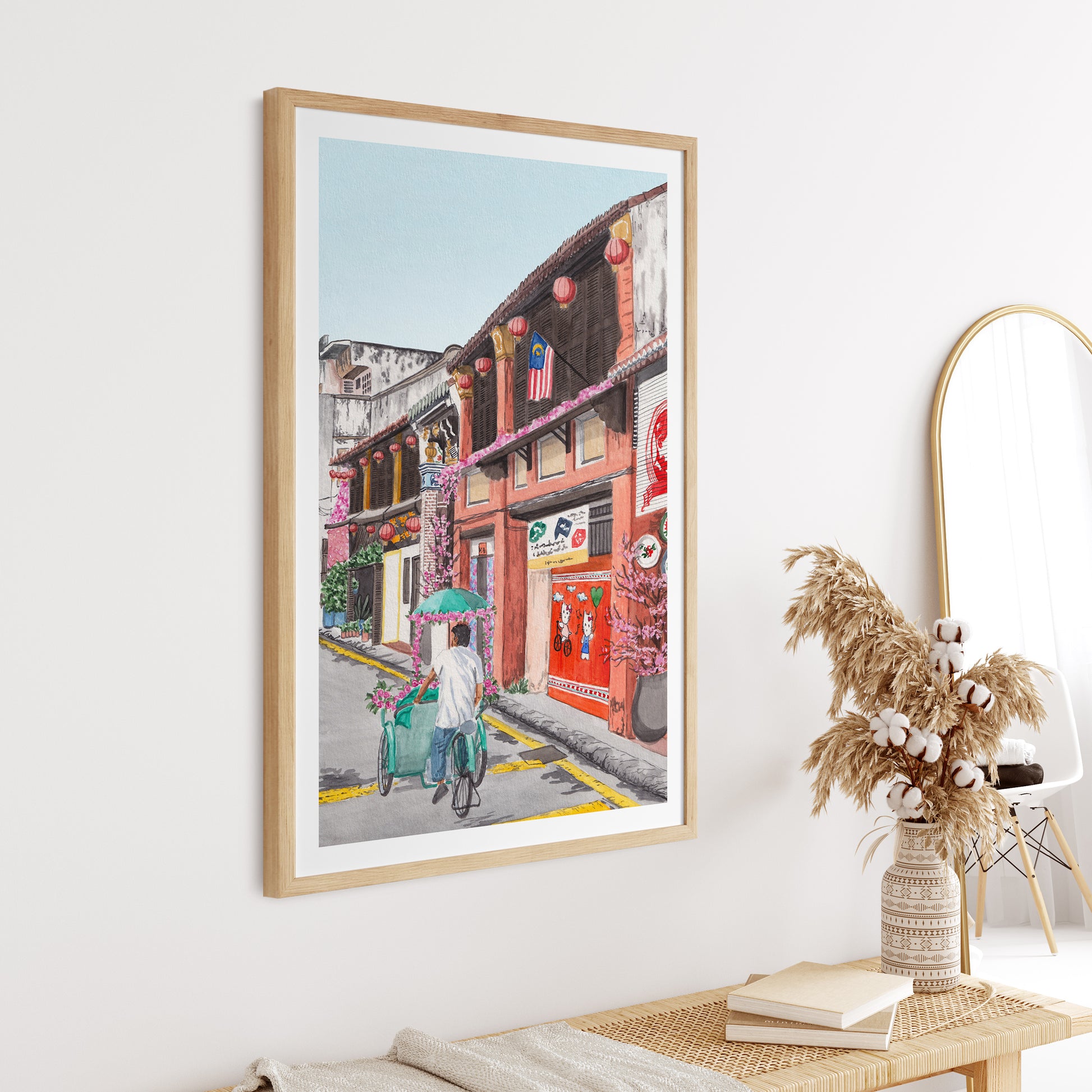 This hand-painted watercolor print captures the charm of George Town, Penang. Featuring its traditional Malaysian architecture and vibrant streets, it reflects the rich cultural heritage and timeless beauty of this historic city.