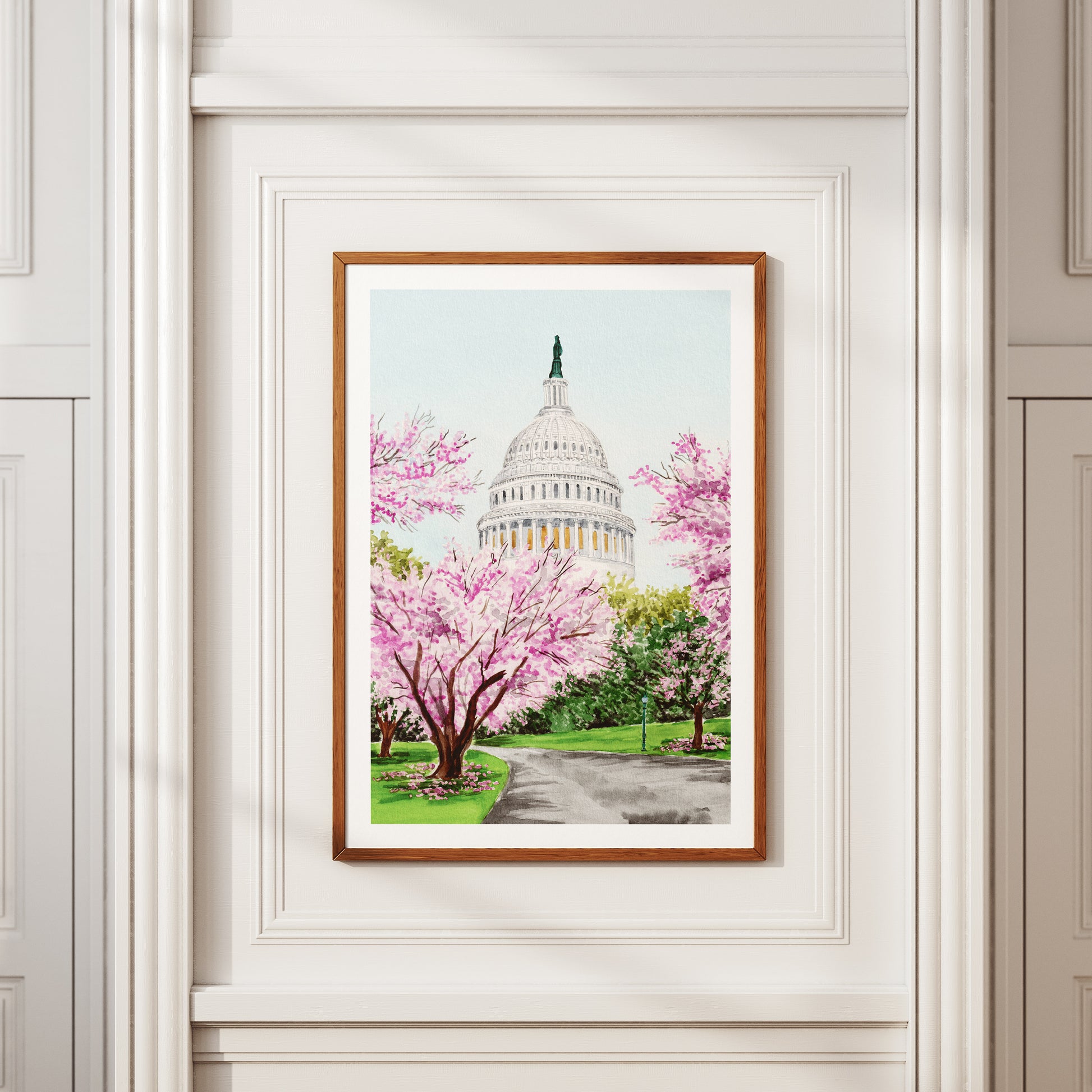 Hand-painted in watercolor, this high-resolution print captures the beauty of Washington DC in spring, featuring its iconic landmarks and seasonal charm. A perfect piece for bringing American heritage into your home or gifting to a travel enthusiast.